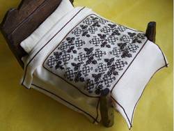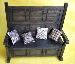 .1. A type of embroidery particularly associated with the Tudor period, is Blackwork. This is a simple yet effective straight stitch, commonly, but not always, worked in black thread on a light background, usually of linen. Where the design needed to be reversible, a double running stitch (also known as Holbein stitch) was used. Blackwork is sometimes referred to as Spanish Work, as it is thought to have been introduced to England by Catherine of Aragon, first wife of Henry VIII. At first it was used to decorate collars and cuffs, but later it was incorporated into furnishings, such as these miniature cushions. (See Below...)