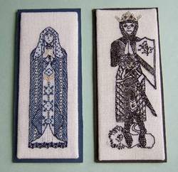 .3.  Embroidered panels were popular and this pair is done in Blackwork. The knight is worked in dark brown thread and the medieval maiden in shades of blue. Both incorporate gold threads which was also common practice at this time.