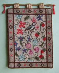 .5.  Designs often incorporated flowers, birds, insects and fruit --- strawberries were a favourite and appear on this miniature wall hanging designed by Sandra Whitehead. I embroidered it in 1/12th scale, using tent stitch.